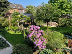 Die Gartenanlage zu dem Siedlungshaus in der Esmarchstr. 2 von 1927 wurde mit Teichanlage, verschiedenen Sitzplätzen und Pflanzzonen Ende der 90er Jahre intensiv gestaltet. Durch Verwendung gebrauchter Materialien wurden Haus und Garten zur Einheit. 2023 wurde die Gartenanlage nach Zukauf des Nachbarhauses erweitert